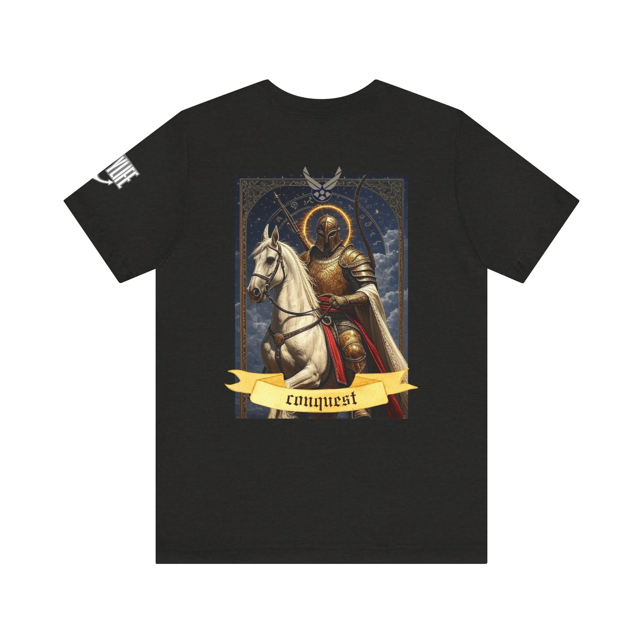 This lightweight jersey tee carries a quiet, dark charm — a modern take on tarot iconography for people who appreciate bold symbolism and wearable art. The front chest hosts a small, tasteful emblem while the back showcases a vivid Death card illustration: a skeletal figure in hooded robes astride a pale horse, framed by ornate detailing and a flowing banner. The cotton knit feels breathable and breaks in comfortably, so the graphic becomes part of your everyday rhythm. Wear it layered under a jacket for city nights, or alone to let the artwork speak. It’s for those who collect imagery with meaning, who favor subtle statements that reveal themselves up close.