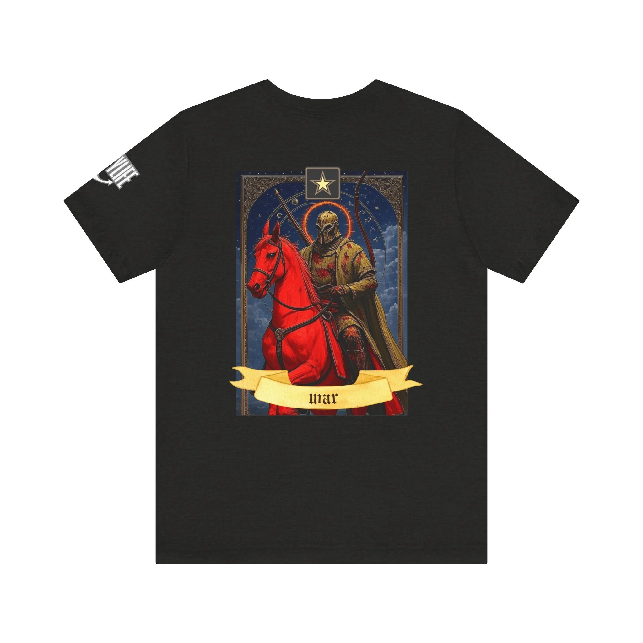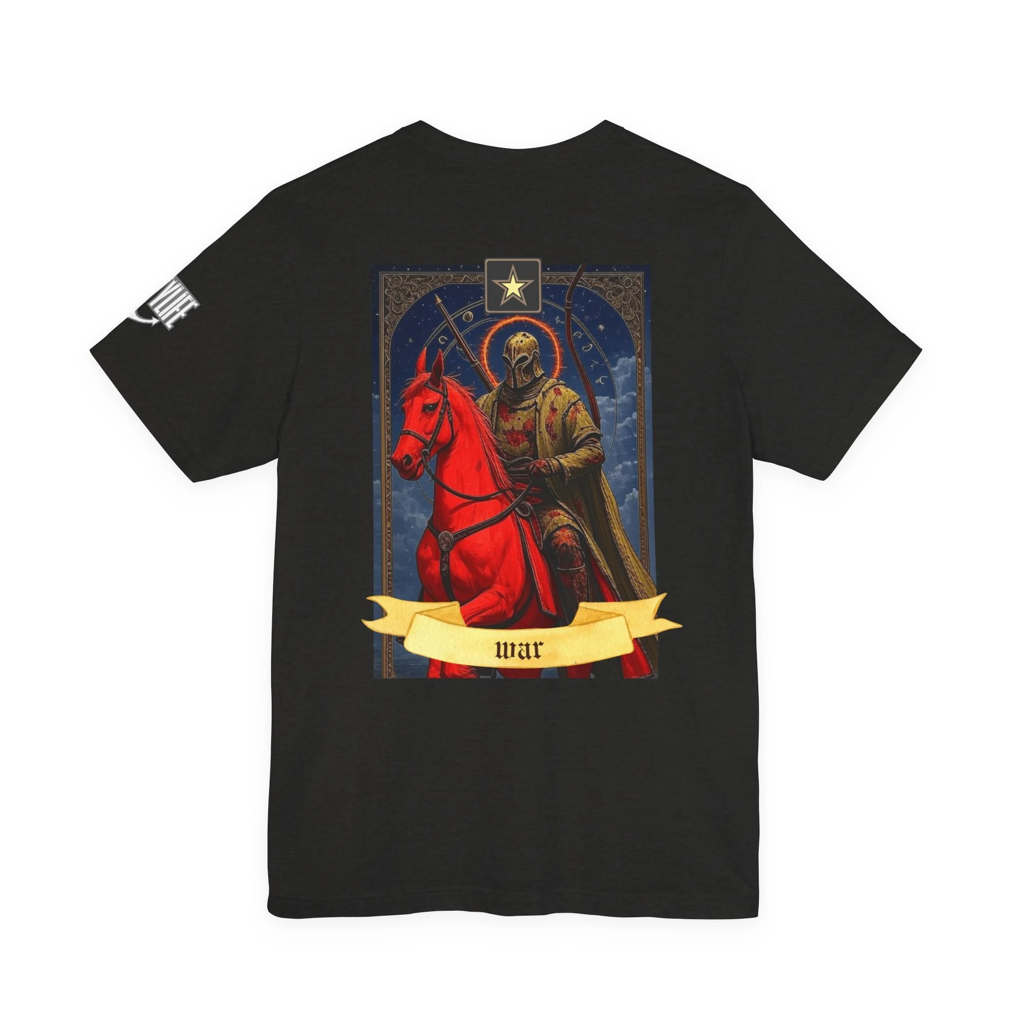 This lightweight jersey tee carries a quiet, dark charm — a modern take on tarot iconography for people who appreciate bold symbolism and wearable art. The front chest hosts a small, tasteful emblem while the back showcases a vivid Death card illustration: a skeletal figure in hooded robes astride a pale horse, framed by ornate detailing and a flowing banner. The cotton knit feels breathable and breaks in comfortably, so the graphic becomes part of your everyday rhythm. Wear it layered under a jacket for city nights, or alone to let the artwork speak. It’s for those who collect imagery with meaning, who favor subtle statements that reveal themselves up close.