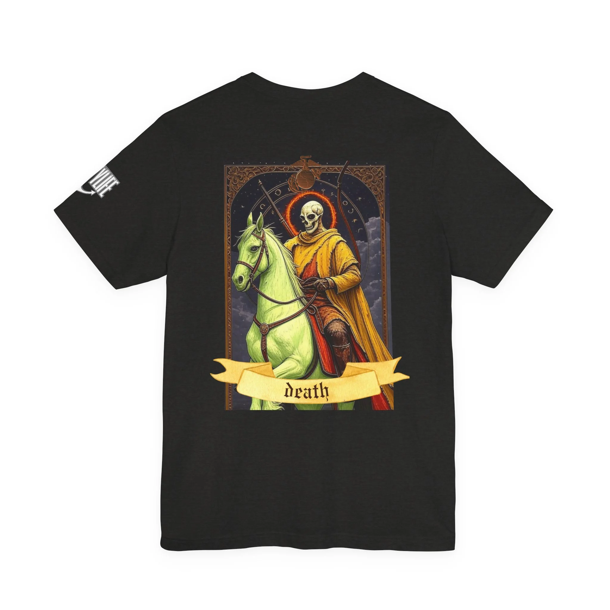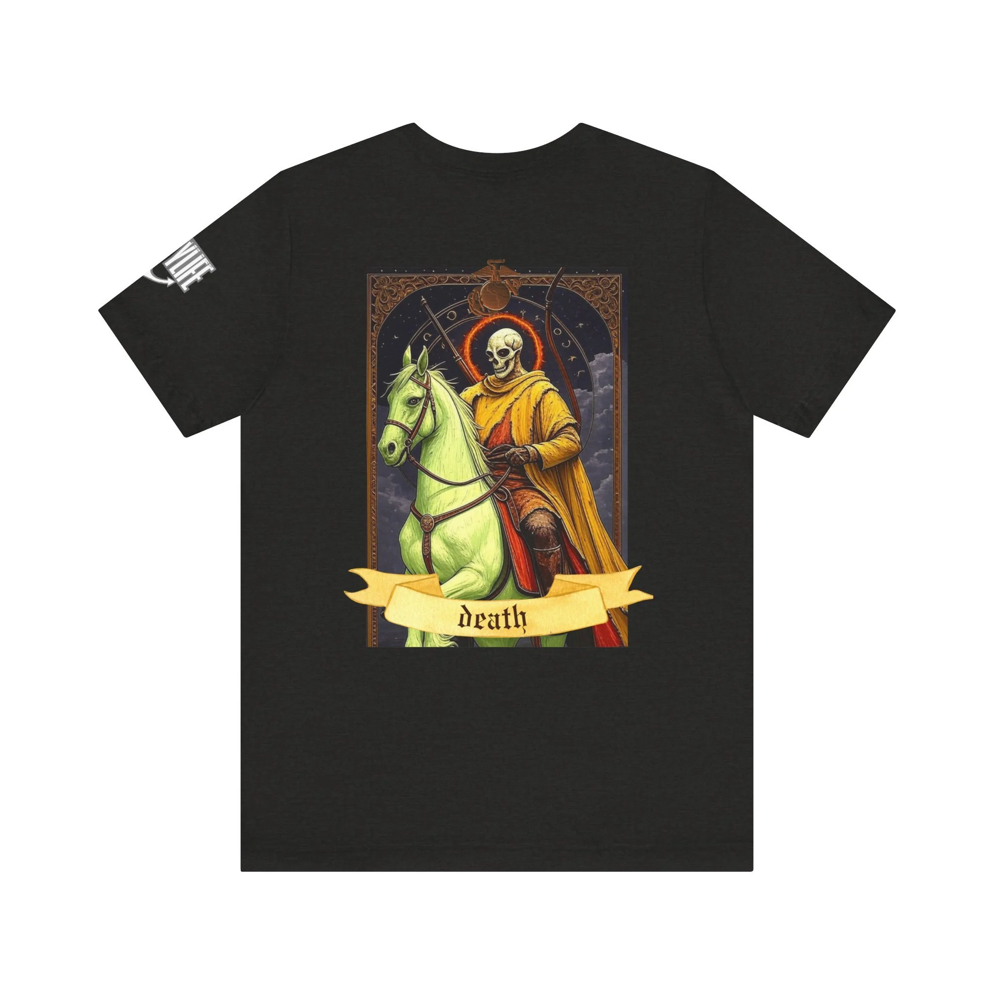 This lightweight jersey tee carries a quiet, dark charm — a modern take on tarot iconography for people who appreciate bold symbolism and wearable art. The front chest hosts a small, tasteful emblem while the back showcases a vivid Death card illustration: a skeletal figure in hooded robes astride a pale horse, framed by ornate detailing and a flowing banner. The cotton knit feels breathable and breaks in comfortably, so the graphic becomes part of your everyday rhythm. Wear it layered under a jacket for city nights, or alone to let the artwork speak. It’s for those who collect imagery with meaning, who favor subtle statements that reveal themselves up close.