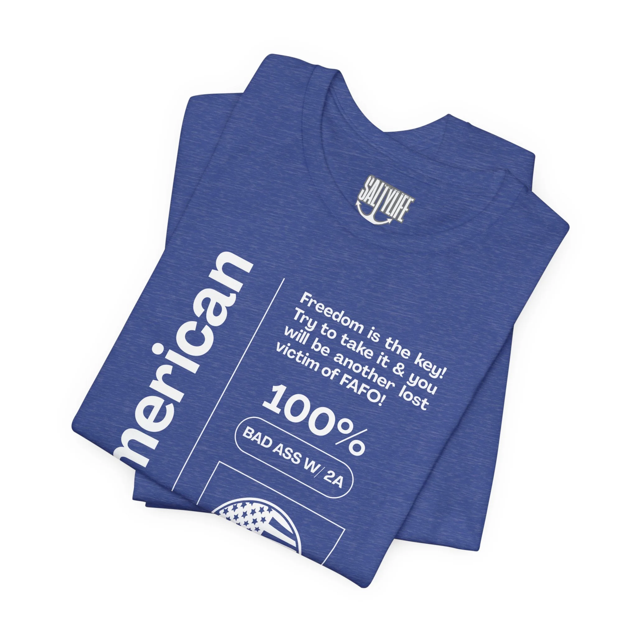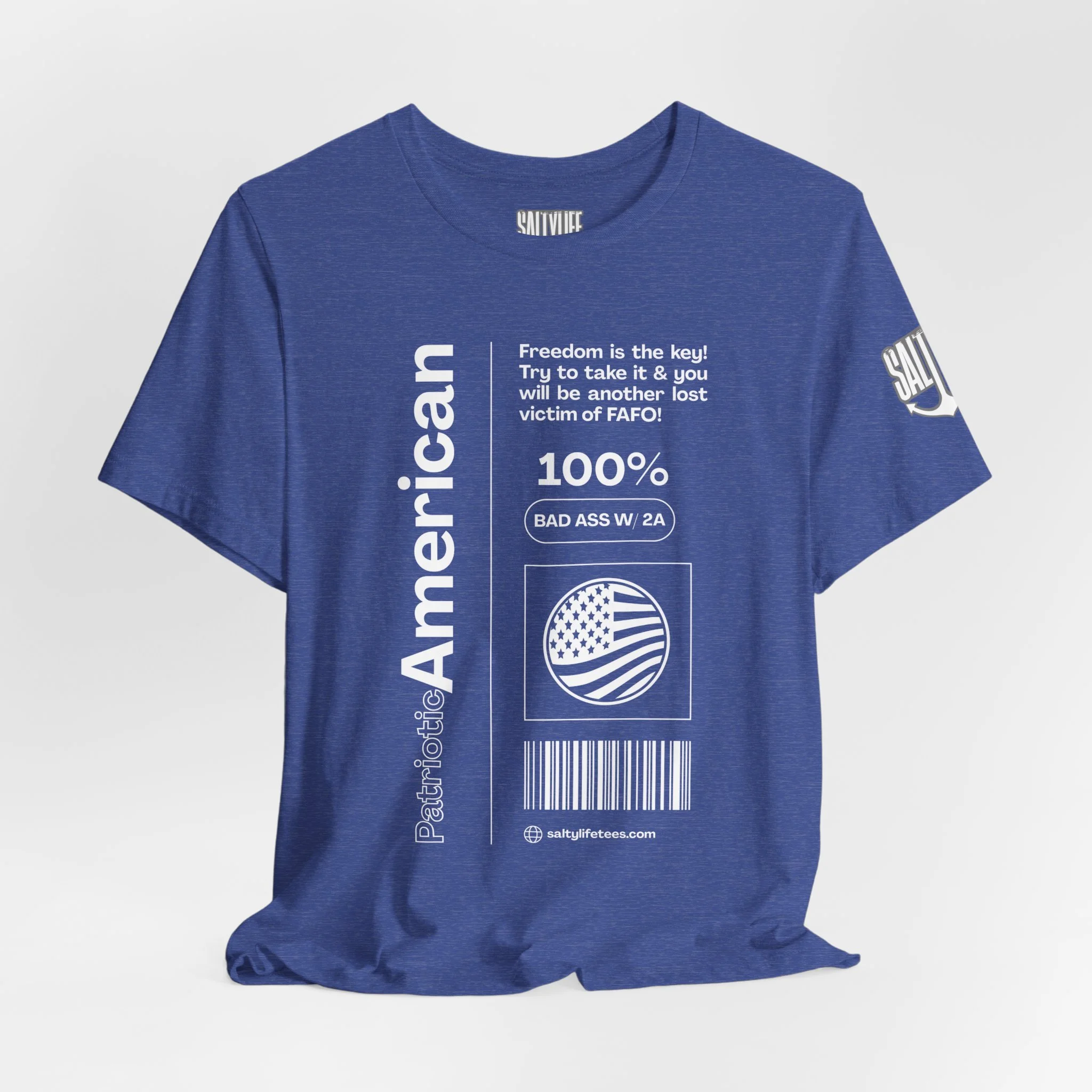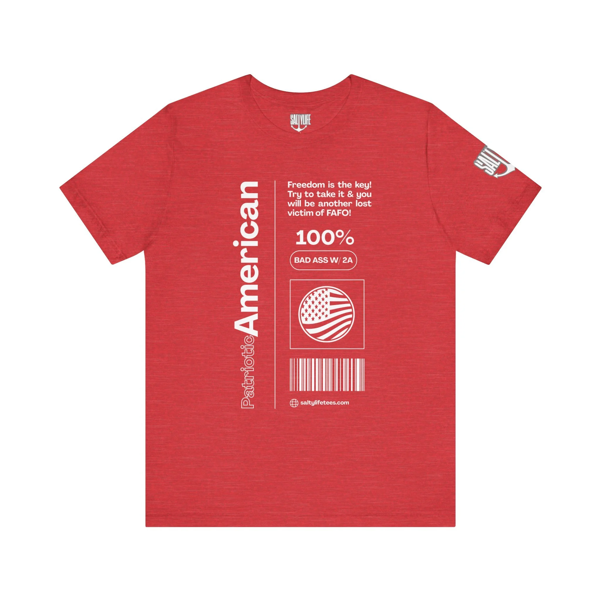 This breathable, lightweight jersey tee carries a bold, slightly irreverent patriotism with a modern streetwear edge. The soft Airlume combed and ring-spun cotton drapes cleanly over the body while the retail cut and crew neckline keep the look tidy and easy to style. Front artwork reads like a label—vertical “American” text, barcode and emblem graphics—giving the shirt a vintage-industrial, tag-as-fashion vibe. Subtle sleeve prints continue the motif for a finished, curated feel. Wear it when you want your statement to look effortless: layered under a jacket, rolled-up with denim, or out for a casual meet-up where nuance matters more than noise.